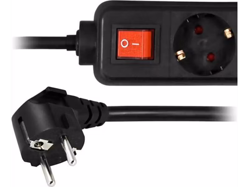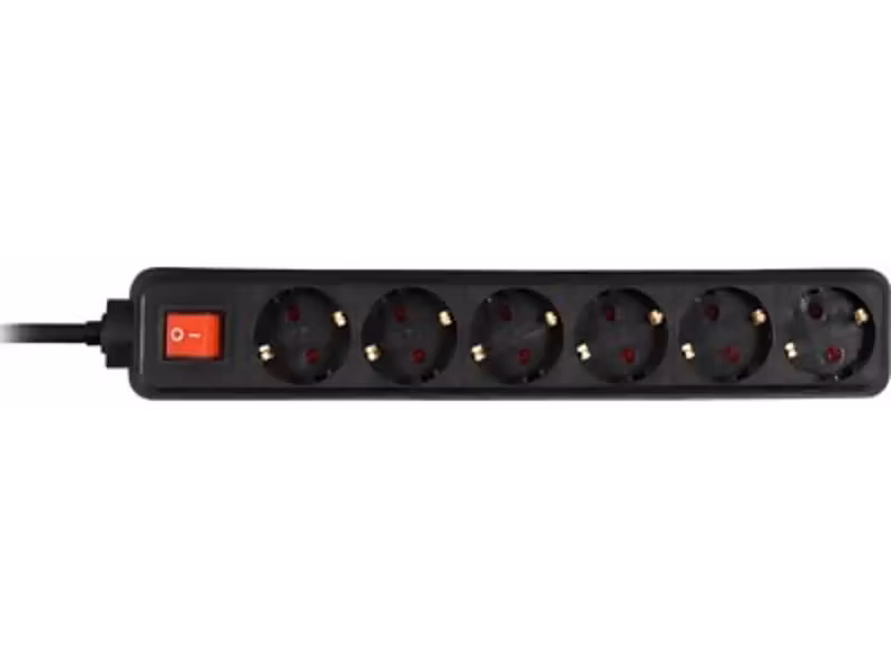 Jordat grenuttag med sex uttag, 1.5m. Tillverkat av tålig plast och försett med petskydd och strömbrytare.